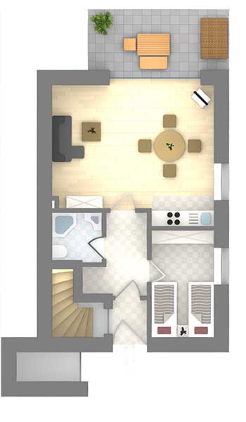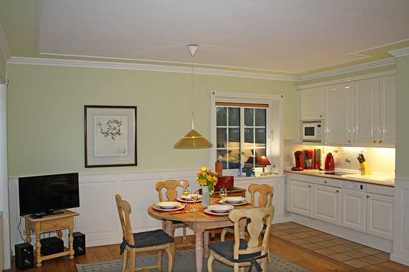 Die Wohnung verfügt über eine gehobene Ausstattung und ist liebevoll im Landhausstil eingerichtet. Sie bietet ein großzügiges Wohn-/Esszimmer mit Küchenzeile, ein Schlafzimmer und Dusche/WC. Sie verfügt zusätzlich über eine große angegliederte Terrasse mit Strandkorb und Gartengarnitur.